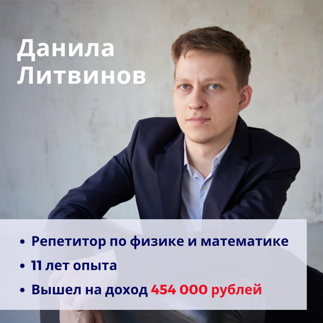 Данила Литвинов – опытный репетитор по физике и математике из Санкт-Петербурга. В прошлом году его пиковый доход составил 315 000 рублей, при этом он работал 40 часов в неделю. Сегодня его стабильный доход составляет 454 000 рублей в месяц, при этом ему удалось сократить количество рабочих часов до 30 и больше времени уделять отдыху и развитию новых продуктов.